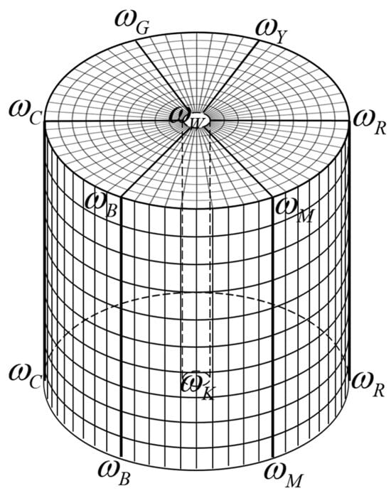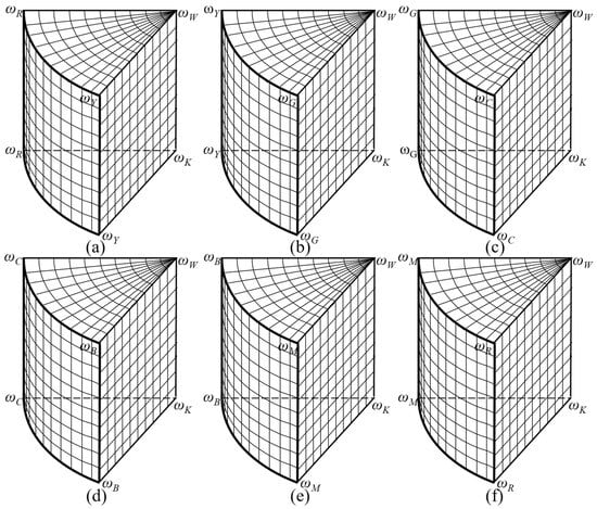 Building upon this cylindrical color model, a full-color-gamut grid color mixing model is developed (Figure 3). This model represents the continuous color space using discrete grid points, generated by blending the weights of eight primary color fibers (, , , , , , , ). The model is divided into six distinct color mixing regions (, , , , , ; Figure 4), each defined by a unique blend of four primary color fibers.