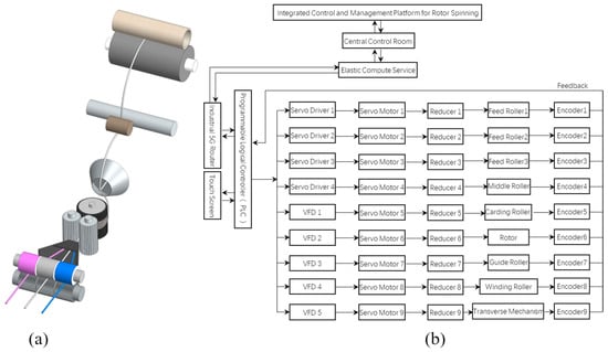 The intelligent rotor spinning system. (a) Spinning mechanical system. (b) Control and servo drive system.