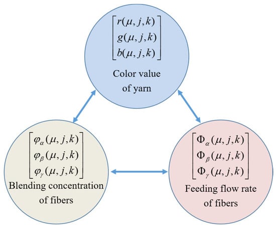 By combining Equations (11)–(13), we derive Equation (14), which illustrates the synergistic regulation mechanism among the feeding flow rate of fibers, blending ratio, and color value of yarn for the machine, displayed in Figure 7. This mechanism links the data chain of fiber blending ratios, yarn color value, and fiber feeding flow rate, establishing the foundation for spinning full-color-gamut blended yarn.