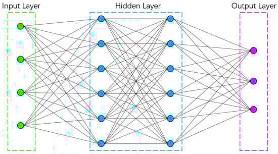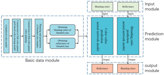 To avoid the extensive work of spinning and measuring color yarns for every grid point in the full-color-gamut, a combined sampling and color-prediction approach was used. This involved building a yarn color prediction system with a neural network model that captures the complex, nonlinear relationships between fiber composition and yarn color via mappings of simple nonlinear functions [28]. The architecture (Figure 8) comprises an input layer with 4 nodes, two hidden layers with 6 nodes each, and an output layer with 3 nodes. Weights and biases are adjusted by backpropagation to minimize mean squared error [29,30]. The neural network color-prediction system (Figure 9) has four modules: a basic data module (training data from representative grid points), a prediction module (separate networks for color value and blending ratio), and input/output modules for data handling and result display. Specifically, color-value prediction identifies the color-mixing region from input reflectance and blending ratios and uses the appropriate sub-model to calculate the yarn’s reflectance. Blending-ratio prediction converts input reflectance to LCH values; the hue (H) determines the color-mixing region and constituent fibers, activating the relevant sub-model to predict blending ratios.