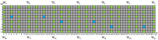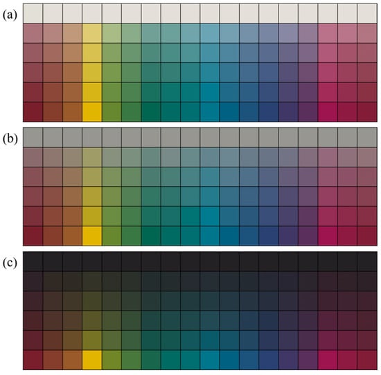 This full-color-gamut color value matrix guided the color arrangement in the grid-based color mixing chromatogram. To illustrate, Figure 5 shows a chromatogram generated using five equal-lightness surfaces (n = 10, j = 1, 4, 6, 8, 11) with the eight primary colors. The black–white fiber ratios in the gray fibers for these surfaces were , , , , , respectively.