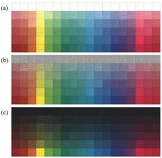 Measured chromatogram of blended yarn knitted fabric (a) Equal lightness surface (j = 1), (b) Equal lightness surface (j = 6), (c) Equal lightness surface (j = 11).