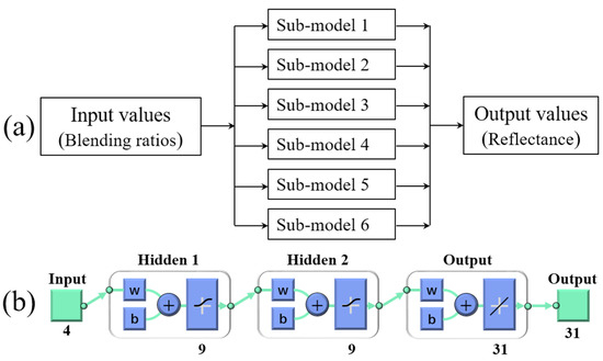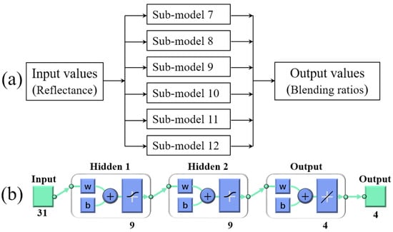 The structure of blending ratios prediction neural network model (a) main structure (b) structure of sub-model.
