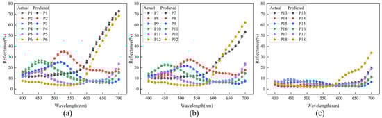 Comparison of predicted reflectance and measured reflectance of validation samples (a) validation samples P1–P6, (b) validation samples P7–P12, (c) validation samples P13–P18.