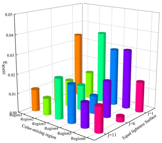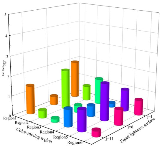 To further assess prediction accuracy, Figure 18 reports mean color differences for the six color-mixing regions: 1.297 (region 1), 1.050 (region 2), 0.622 (region 3), 0.546 (region 4), 1.346 (region 5), and 0.611 (region 6). The overall regional average was below 1.5, indicating generally accurate predictions. Ranking by accuracy: region 4 > region 6 > region 3 > region 2 > region 1 > region 5.