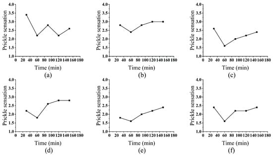 Figure 3. Effect of Treatment Time on Prickle Sensation: cellulase (a), laccase (b), hemicellulase (c), xylanase (d), pectinase (e), and alkaline protease (f).