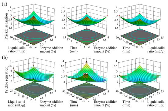 To optimize the enzymatic modification conditions, a Box–Behnken design (BBD) was employed based on single-factor experiment results, focusing on three significant factors: enzyme addition amount (A), liquid-to-solid ratio (B), and enzymatic treatment time (C). The prickle sensation score was set as the response variable (Y), and a quadratic polynomial regression model was established to describe the relationship between the independent variables and the response value (Figure 4).