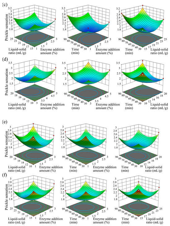 Figure 4. Three-dimensional response surface plots illustrating the interactive effects of enzyme addition amount, liquid-to-solid ratio, and treatment time on prickle sensation for each enzyme, with labels indicating specific enzyme identities and optimal parameter regions. Figure a–f: cellulase (a), laccase (b), hemicellulase (c), xylanase (d), pectinase (e), and alkaline protease (f). Each plot shows a smooth surface with a central minimum, representing the optimal condition for prickle sensation reduction.
