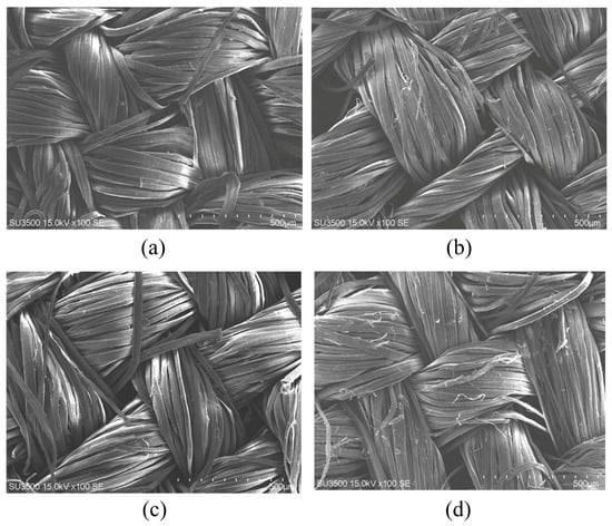 Figure 5. SEM Images of Ramie Fabric Surfaces. (ac) Enzyme-combined treated samples (Sample 1–3#), demonstrating reduced fuzz, smoother surfaces, and uniform fiber structures; (d) Untreated control (Sample 4#), showing rough texture and abundant fuzz. Accelerating voltage: 15 kV.