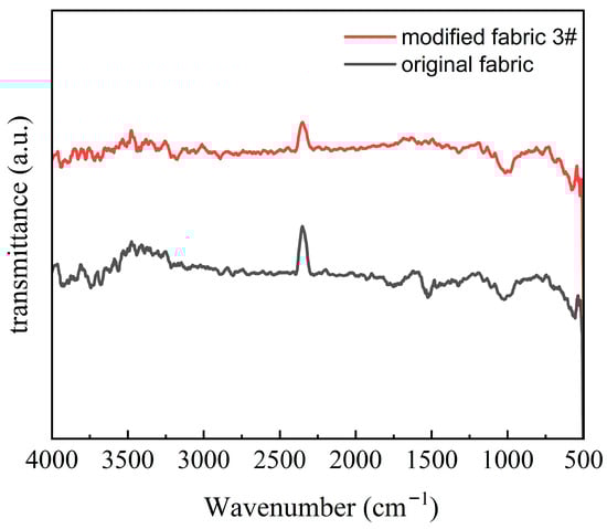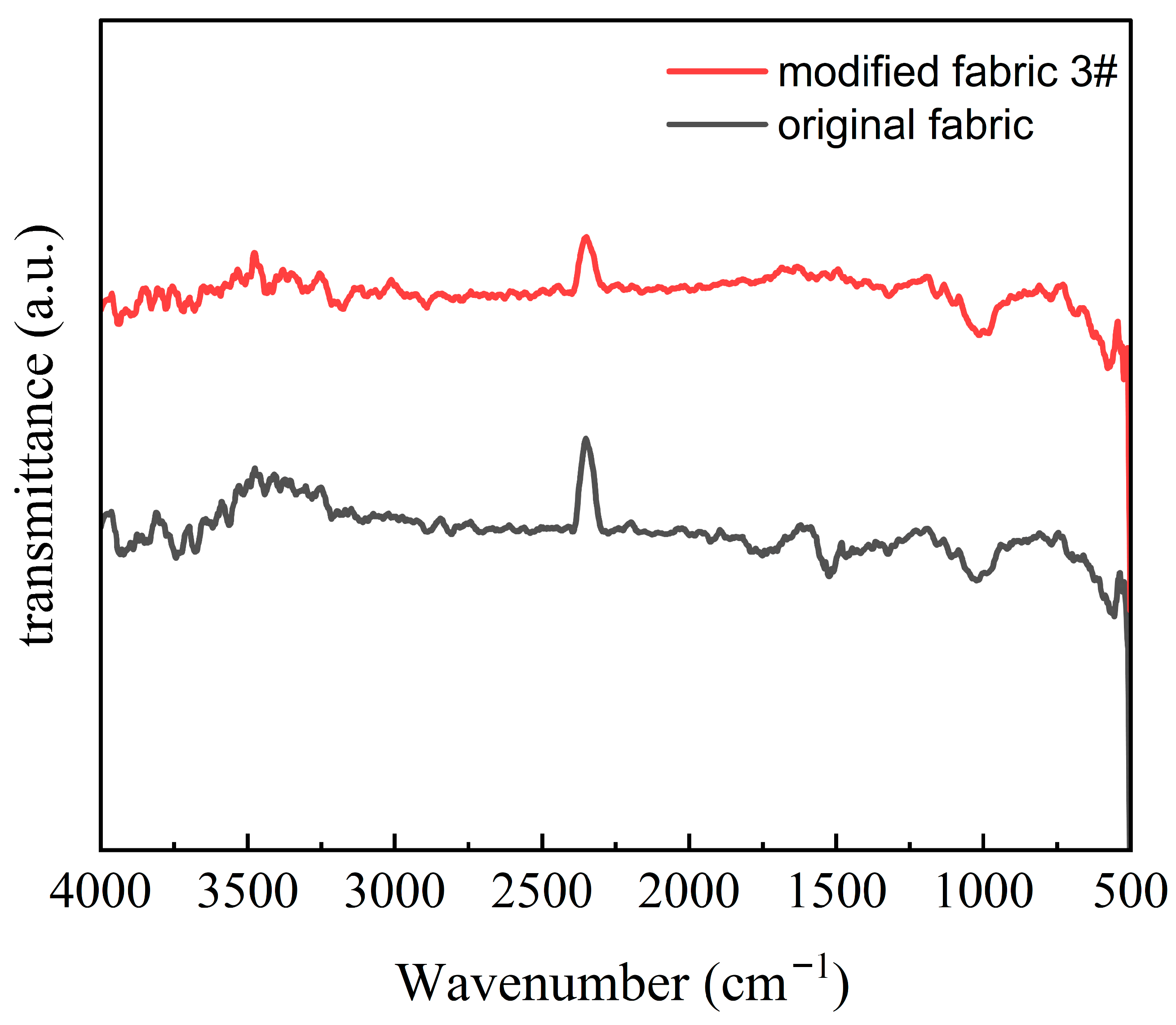 To further verify that the enzymatic treatment did not alter the fundamental chemical composition of the fibers, FTIR analysis was performed. Figure 6 compares the FTIR spectra of the untreated control (Sample 4#) and the optimally enzyme-treated fabric (Sample 3#). The results show no significant changes in the characteristic absorption peaks before and after modification, indicating that the bio-enzyme treatment selectively degraded surface and inter-fibrillar components without introducing new chemical groups or significantly altering the elemental composition of the ramie fibers. This preservation of chemical integrity underscores the specificity of the enzymatic action and its advantage in maintaining the inherent properties of the fiber while improving tactile comfort.