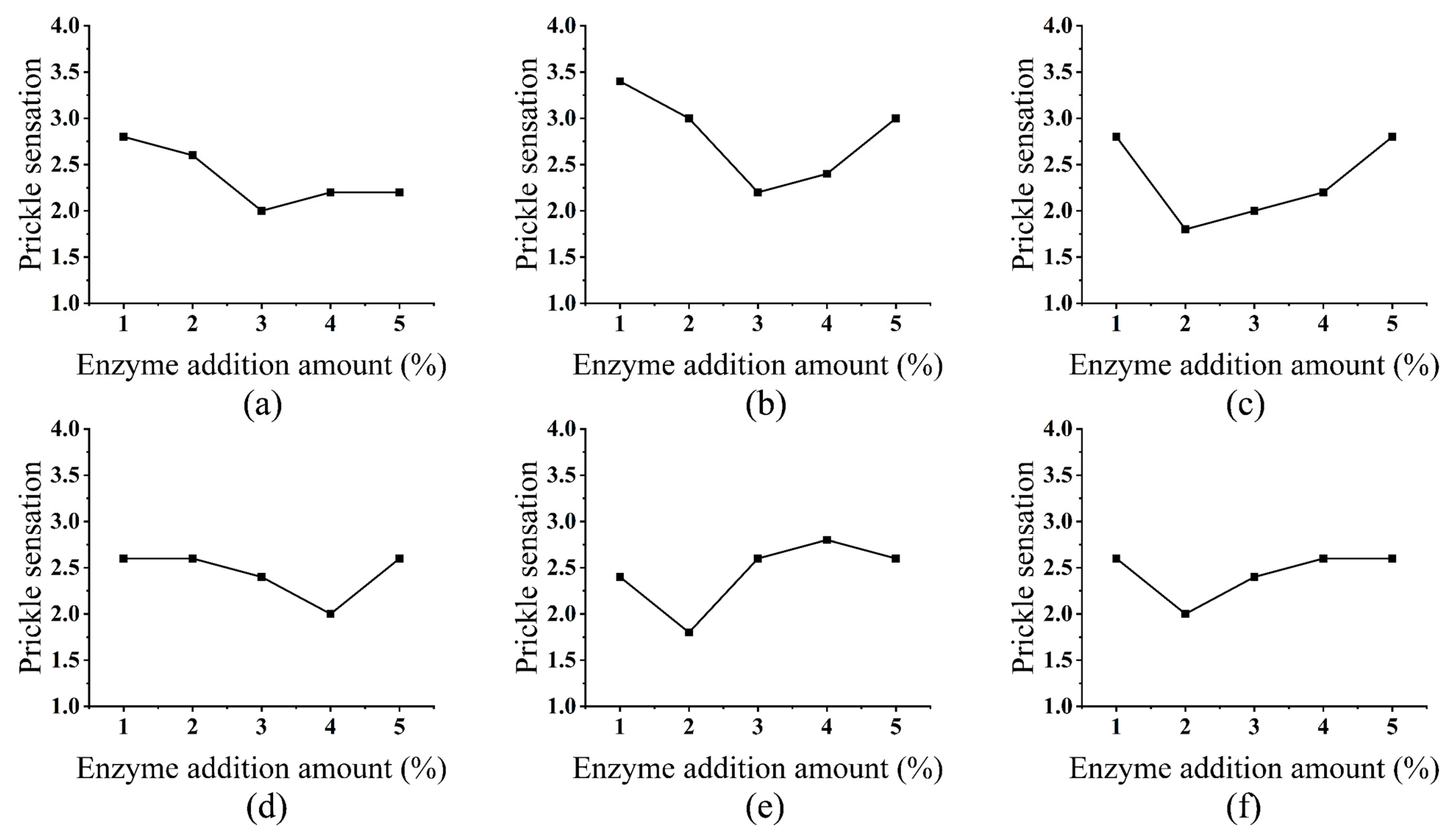Figure 1. Effect of Enzyme Addition Amount on Prickle Sensation: cellulase (a), laccase (b), hemicellulase (c), xylanase (d), pectinase (e), and alkaline protease (f).