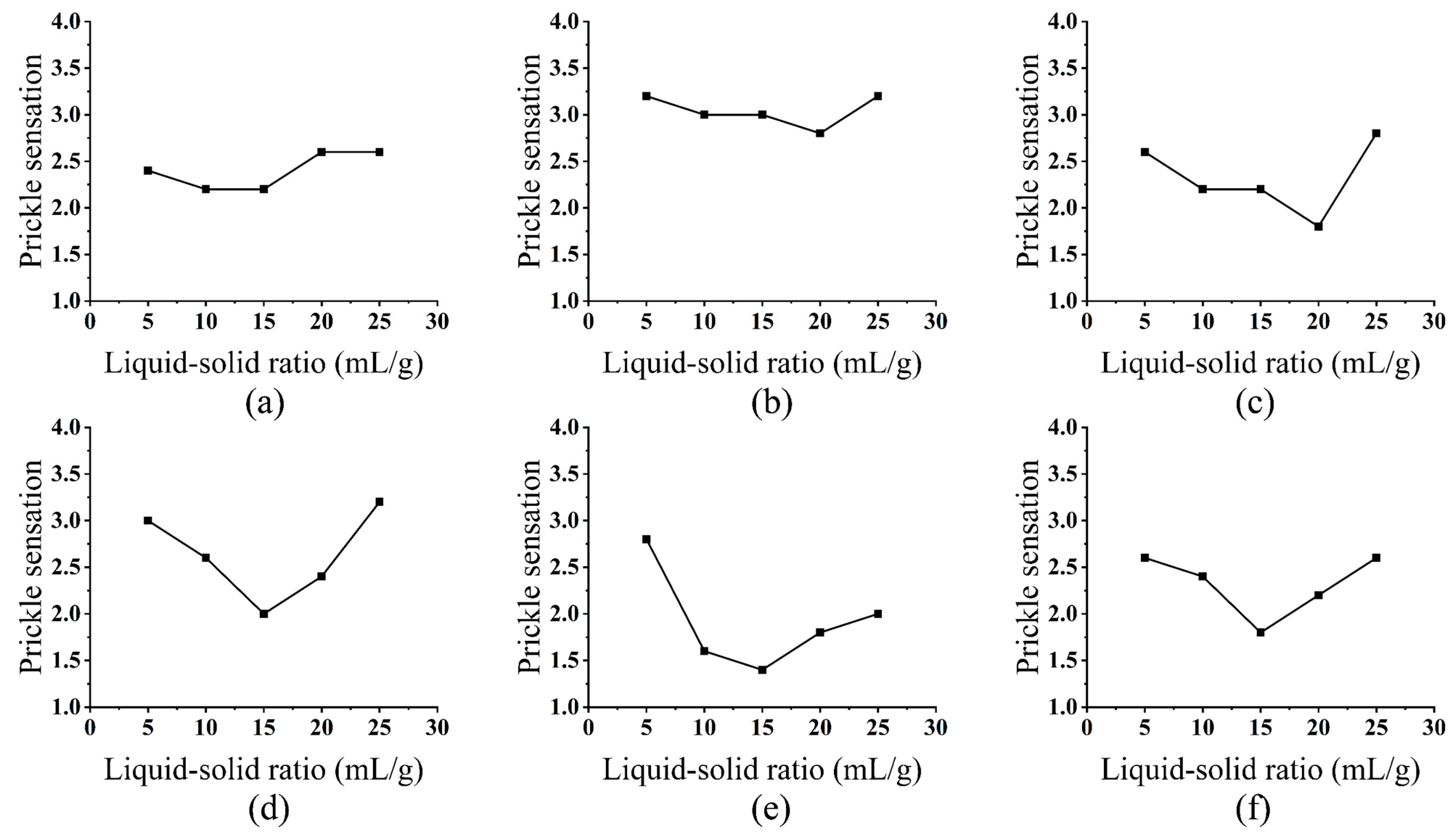 Figure 2. Effect of Liquid-to-Solid Ratio on Prickle Sensation: cellulase (a), laccase (b), hemicellulase (c), xylanase (d), pectinase (e), and alkaline protease (f).
