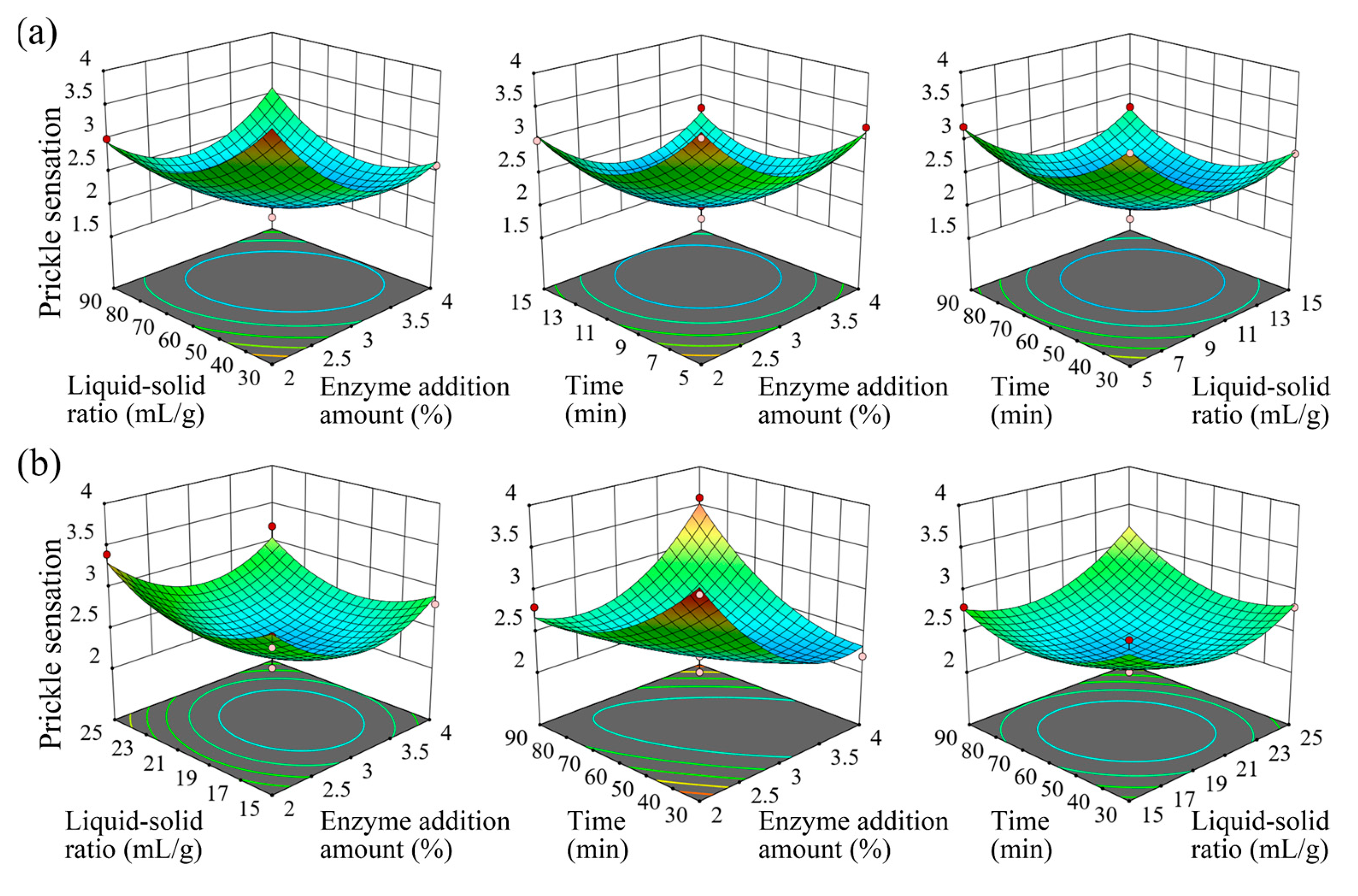 Experimental validation under the predicted optimal conditions confirmed the reliability of the response surface methodology (RSM) model, with prickle sensation scores exhibiting an average error of less than 5% relative to model predictions. For cellulase-treated samples, the predicted score of 2.0 ± 0.1 closely matched the measured value of 1.9 ± 0.2, demonstrating strong alignment with theoretical expectations. This level of accuracy exceeds that of traditional single-factor optimization methods [34], underscoring RSM’s superiority in capturing complex parameter interactions and validating optimal process conditions.