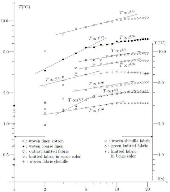 While the presented experiment and the theoretical approach (modelling) focus on two different materials, fingertip and textile fabrics, the thermal contact behaviour between two fingertips was examined as a reference for this study. Figure 4 demonstrates that the type of fabric influences the transient temperature behaviour. To assess whether the experiments might have been significantly affected by fingertip contact, the same experiment was repeated using two fingertips in contact with a thermocouple junction. The results, presented in Figure 6, show that the experimental data in this case could be fitted to t1/10. Notably, the exponent 1/10 was smaller than all exponent values observed in Figure 4. This suggests that the influence of the fingertip was less significant than that of the fabric itself.
