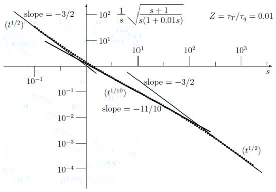 Figure 7 shows a plot of Equation (24) for a value Z = τT/τq = 0.01. It turns out that in the interval 0.5 < log(s) < 1.5, the plot is very well fitted to a slope of −11/10, which is equivalent to a function t1/10 in the time domain. At the same time, it has been proven that human tissues can be modelled using the dual-phase model.
