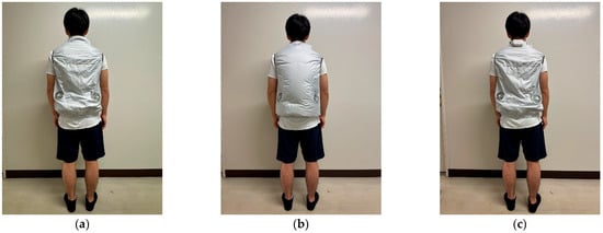 To ensure consistent device performance during the experiment, the fan-cooling jacket was operated at its maximum airflow setting (70 m3/h). The neck cooler was also used at its maximum intensity, beginning one minute prior to the onset of cooling, at which time the surface temperature of the cooling plate was 23 °C. The attire was designed to replicate summer conditions: a short-sleeved shirt (88% polyester, 12% polyurethane), shorts (80% polyester, 20% nylon), underwear (93% cotton, 7% polyurethane), and socks (47% acrylic, 29% cotton, 18% nylon, 4% polyester, 2% polyurethane), with the fan-cooling jacket worn as outerwear. In the FC condition, the fan was activated, whereas in the NC condition, a thermoelectric neck cooler was used. The clothing configuration for each condition is depicted in Figure 1.