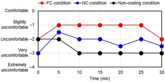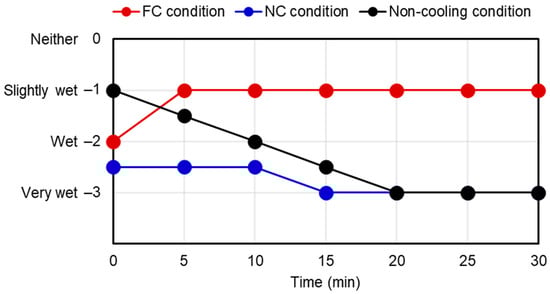 The median values of participants’ thermal comfort and wetness sensation, obtained following the heat acclimation period, are presented in Figure 2 and Figure 3. In the non-cooling condition, thermal comfort progressively declined towards discomfort as the experiment progressed, and wetness sensation also shifted towards “very wet.” This indicates an increase in psychological heat stress over time. Conversely, in the FC condition, cooling with the fan improved both thermal comfort and wetness sensation by approximately one level from the conclusion of the acclimation period (0 min) onward, confirming a reduction in psychological heat stress. Notably, thermal comfort was maintained in a favorable state for up to 25 min, and wetness sensation remained favorable until the end of the experiment, with neither showing a decreasing trend. At the 20 min mark, the FC condition demonstrated an approximately two-step greater reduction in heat stress than the non-cooling condition. In the NC condition, thermal comfort improved by approximately one level after cooling commenced, confirming a temporary reduction in heat stress. However, wetness sensation deteriorated over time, shifting towards “very wet.” This suggests that although local cooling of the neck can provide temporary comfort, it is insufficient to noticeably improve the humid environment inside the clothing.