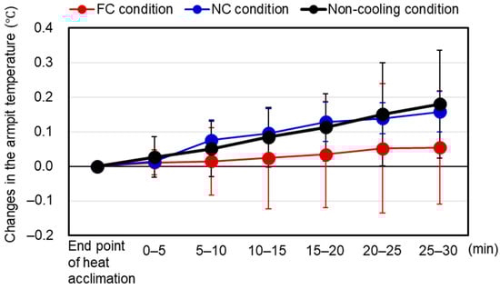 Changes in the armpit temperature are shown in Figure 5. The FC condition exhibited a slight upward trend; however, the magnitude of this increase was smaller than that observed in the non-cooling and NC conditions, with a significant difference (p < 0.05) compared to the non-cooling condition after 25 min. In contrast, the NC condition, akin to the non-cooling condition, displayed an upward trend over time, with no indication of suppression of the core temperature increase.
