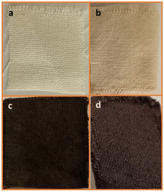 Visual appearance of different acrylic fabric modifications (a) Pristine Acrylic (AC), (b) amidoximated acrylic (TAC), (c) magnetite Fe3O4-coated amidoximated acrylic (Fe3O4-TAC), (d) silver nanoparticles loaded on magnetite Fe3O4-coated amidoximated acrylic (Ag/Fe3O4-TAC).