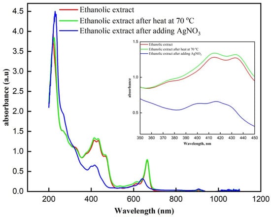 UV-Visible absorption spectra of ethanolic extract under different conditions. Comparison of the UV-Visible absorption spectra of the ethanolic extract, ethanolic extract after heating at 70 °C, and ethanolic extract after the addition of AgNO3.