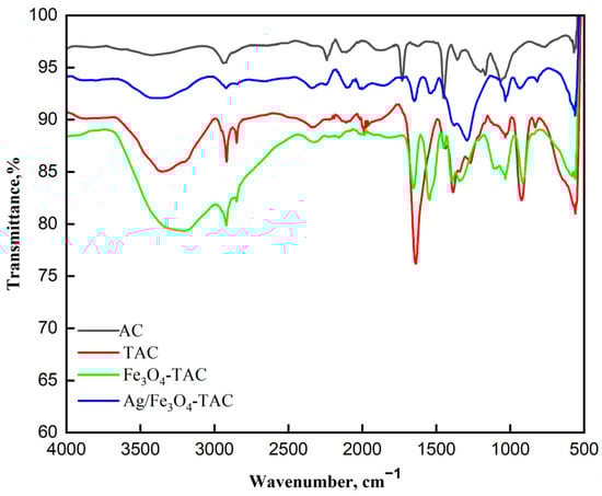The magnetic properties of Fe3O4-TAC and Ag/Fe3O4-TAC were assessed utilizing a vibrating sample magnetometer (VSM, Model 7400, Lake Shore Cryotronics, Inc., Westerville, OH, USA). Fourier-transform infrared spectroscopy (FTIR) was employed, through a PerkinElmer Spectrum 100 device, to analyze the chemical composition of pristine acrylic (AC), TAC, Fe3O4-TAC, and Ag/Fe3O4-TAC.