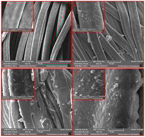 SEM at high and low modifications images of acrylic fabrics: (a): AC, (b): TAC, (c): Fe3O4-TAC, and (d): Ag/Fe3O4-TAC.