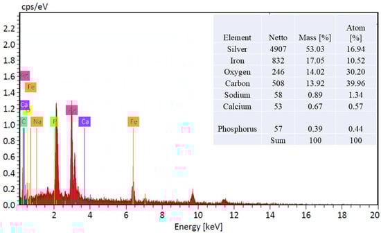 EDX spectrum and elemental composition of Ag@Fe3O4-Coated amidoximated acrylic fabric.