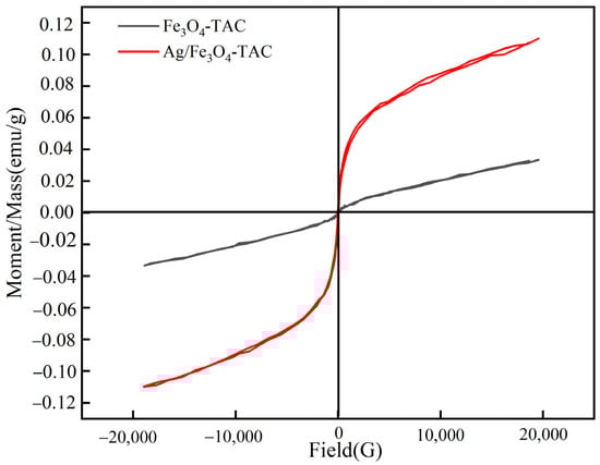 The magnetic characteristics of Fe3O4-TAC and Ag/Fe3O4-TAC were evaluated (Figure 6). The magnetic hysteresis curves elucidate the correlation between the applied magnetic field (Gauss) and the magnetic moment per unit mass (emu/g) for each material. For the Fe3O4-TAC, the coercivity is quantified at 30 G, accompanied by a magnetization of 0.0334 emu/g. The hysteresis loop for this material exhibits a relatively narrow profile, signifying that it possesses a moderate resistance to fluctuations in its magnetic state and a modest magnetic moment. Such behavior is characteristic of magnetically soft materials, wherein the magnetization can be readily reversed with minimal energy expenditure [34]. Ag/Fe3O4-TAC reveals a reduced coercivity of 18.79 G coupled with a considerably elevated magnetization of 0.1099 emu/g. The hysteresis loop for this material is broader and exhibits a steeper gradient, particularly at the initial slope, which signifies a more robust and rapid magnetic response to the applied field. The diminished coercivity implies that the incorporation of silver nanoparticles decreases the energy requisite for altering the magnetization state, rendering the material more reactive to external magnetic fields [35]. Concurrently, the augmented magnetization reflects an enhanced magnetic moment, likely attributable to the supplementary magnetic contribution from the silver nanoparticles and their interaction with the magnetite coating. The morphology and attributes of the hysteresis loops illustrate that Ag/Fe3O4-TAC demonstrates superior magnetic properties, thereby rendering it more advantageous for applications necessitating high magnetic sensitivity and efficiency. The elevated magnetization and reduced coercivity of Ag/Fe3O4-TAC indicate its capability to achieve a more potent magnetic response with diminished resistance to demagnetization.