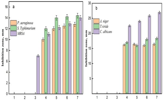 Inhibition zone of (a) antibacterial activity of samples against some strains bacteria, (b) antifungal activity of samples against some strains fungi; (1) AC, (2) TAC, (3) Fe3O4-TAC, (4) 1 mmol Ag/Fe3O4-TAC, (5) 2 mmol Ag/Fe3O4-TAC, (6) 3 mmol Ag/Fe3O4-TAC, (7) 4 mmol Ag/Fe3O4-TAC.