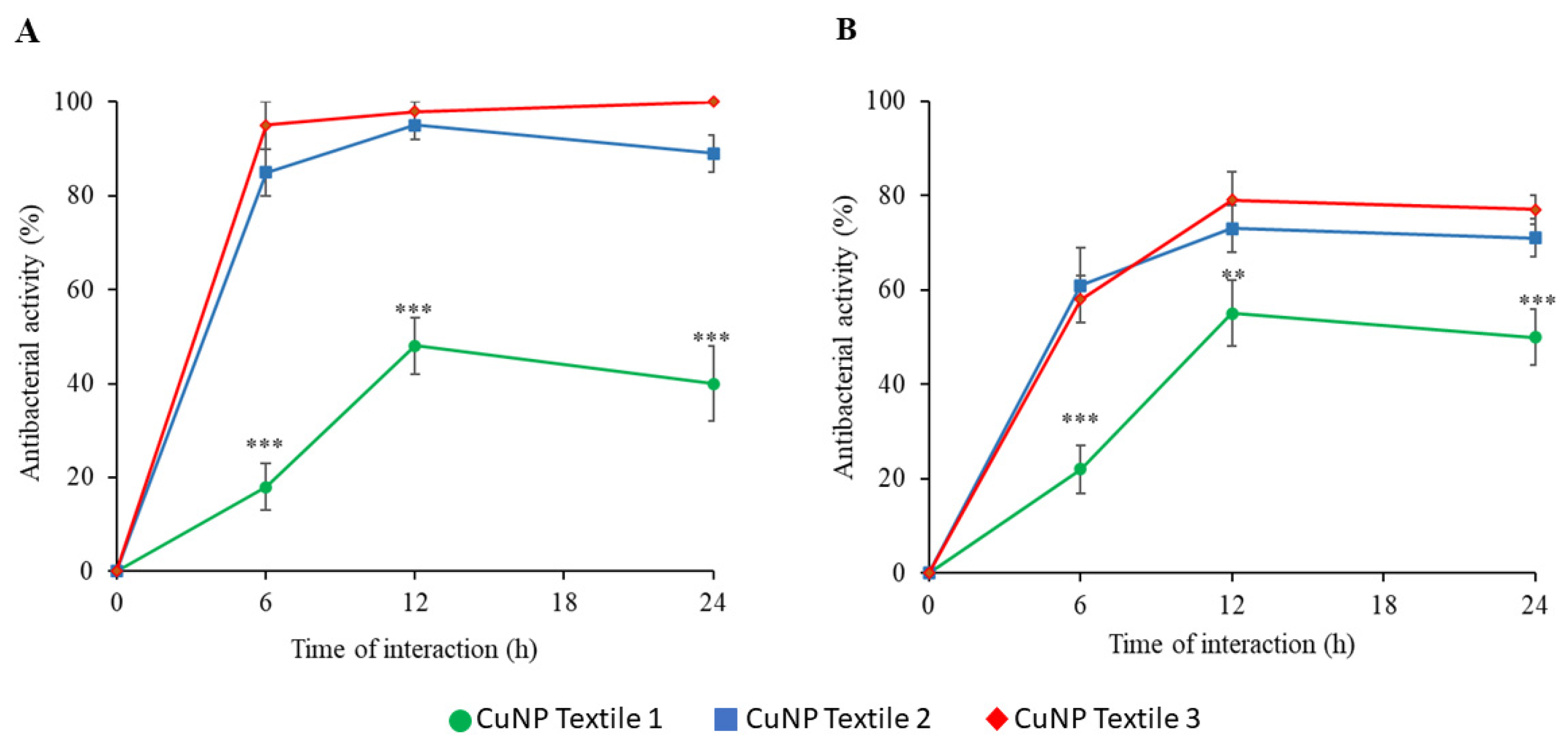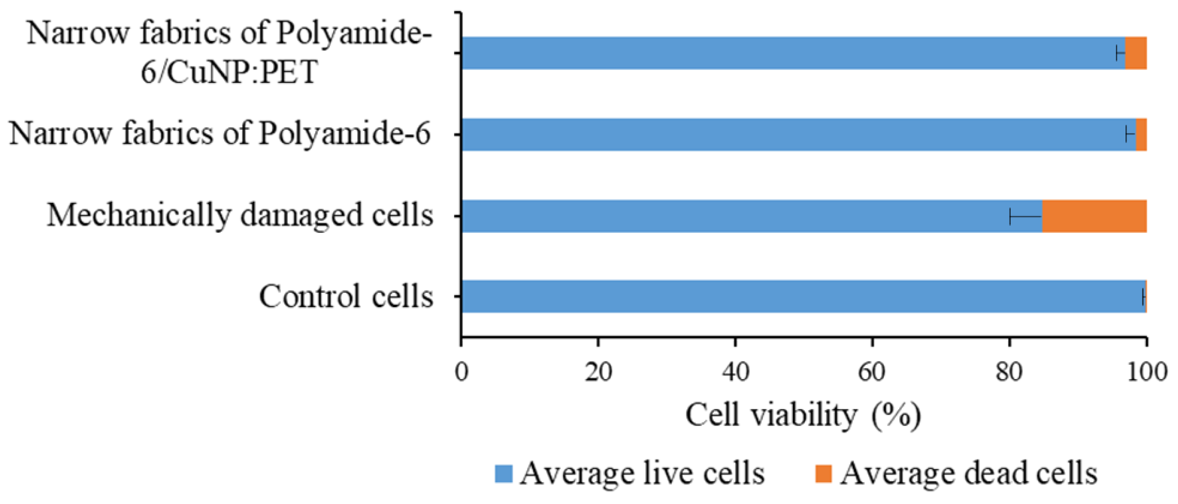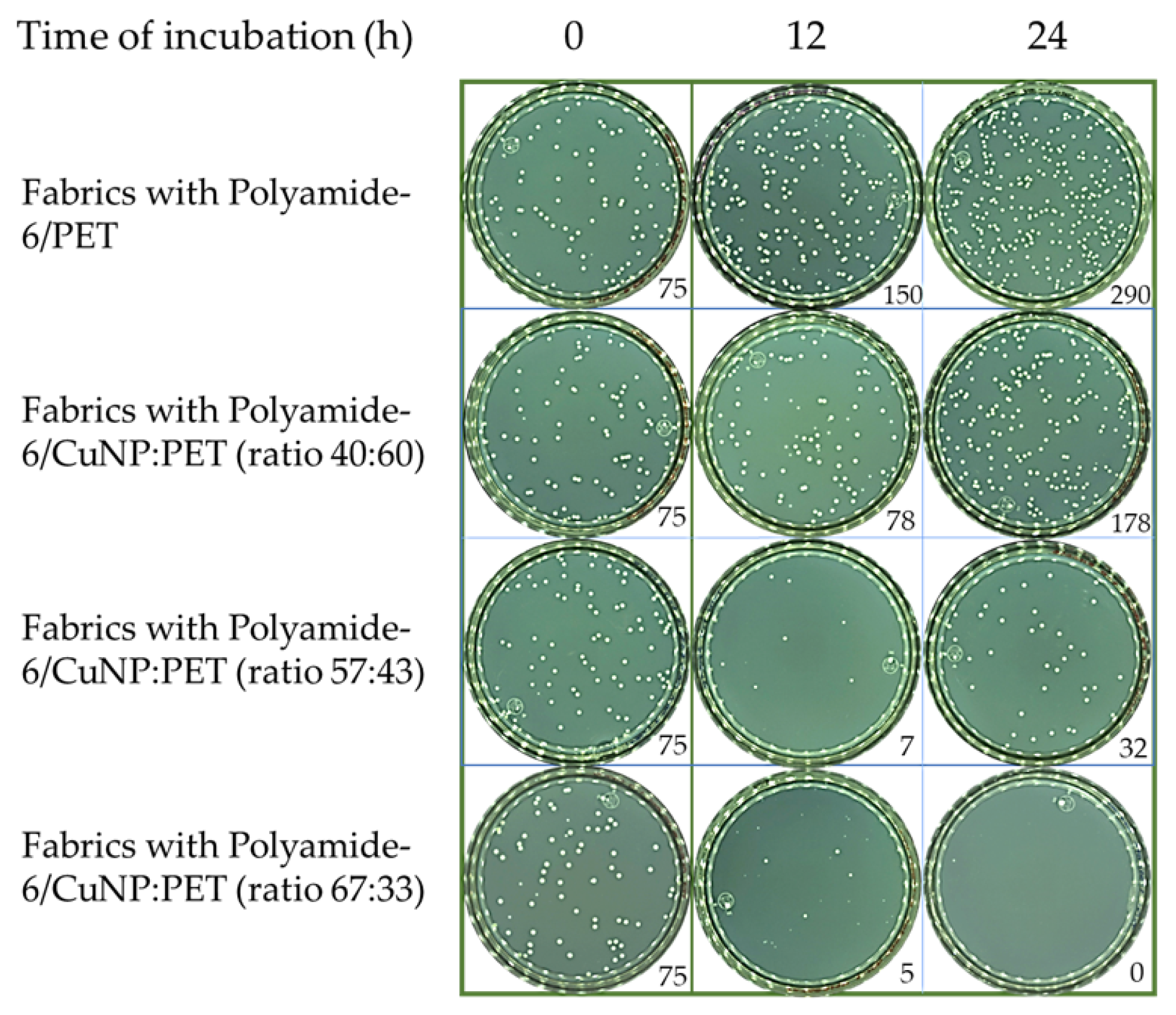 - Ali, A.; Petrů, M.; Azeem, M.; Noman, T.; Masin, I.; Amor, N.; Militky, J.; Tomková, B. A comparative performance of antibacterial effectiveness of copper and silver coated textiles. J. Ind. Text. 2023, 53, 15280837221134990. [Google Scholar] [CrossRef]