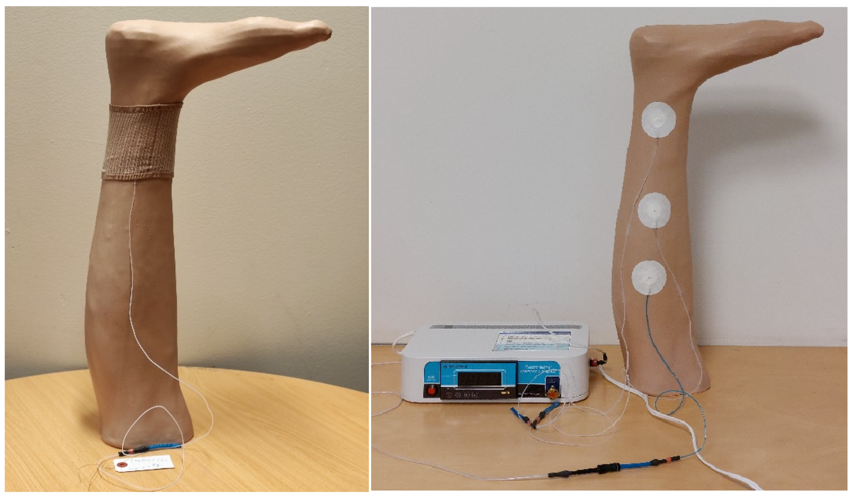 | Pressure | Pressure | Leg mannequin with an AMI air-pack pressure sensor (AMI3037-SB-SET, SANKO TSUSHO Co., Ltd., Tokyo, Japan) | DS/CEN/TR 15831 Medical Compression Hosiery—Recommendations for Testing of Hosiery; European Committee for Standardisation (CEN): Brussels, Belgium, 2009. |
