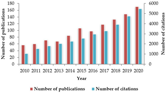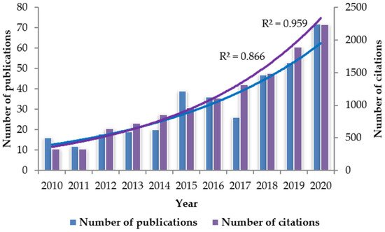 Publications and citations number of scientific articles reporting on the use of fluorescence spectroscopy for studying food quality and/or authenticity. Information taken from the database Scopus, with search criteria: Article title, Abstract, Keywords; fluorescence spectroscopy AND Article title, Abstract, Keywords; food quality OR Article title, Abstract, Keywords; food authenticity. The data were obtained in June 2021.
