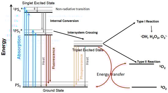 For PDT to take place, the molecule goes to its triplet excited state by the so-called intersystem crossing. This event has a low probability according to the selection rules of quantum mechanics and this is a metastable state. From this state it can also return to its ground state by relaxation with the final result in heat or emitting light, which is called phosphorescence. From this metastable state, two types of PDT mechanisms have been proposed to lead to cell death [41]. The type I mechanism describes the generation of oxidative species, namely hydroxyl radical (•OH), hydrogen peroxide (H2O2), and superoxide ion (O2) via electron transfer [41].