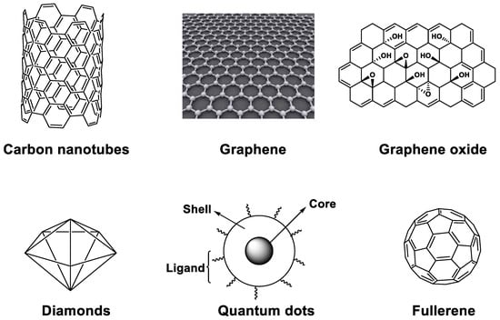 There is a wide family of carbon-based materials (allotropes of carbon) such as carbon nanotubes (CNTs), graphene, graphene oxide, diamonds, carbon dots (CQD) and fullerene [49] (Figure 2).