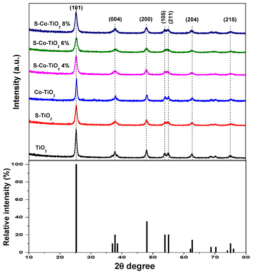 The crystal phase of the photocatalyst was analyzed using XRD, and the XRD pattern is shown in Figure 1. The diffraction pattern of pure TiO2, S-TiO2, Co-TiO2, and co-doped S-Co-TiO2 showed the major peaks of the crystal planes for (101), (200), (105), (211), (204), and (215) corresponded to the anatase phase of TiO2 (JCPDS reference No. 21-1272), and no other phases such as rutile or brookite appeared in the samples.