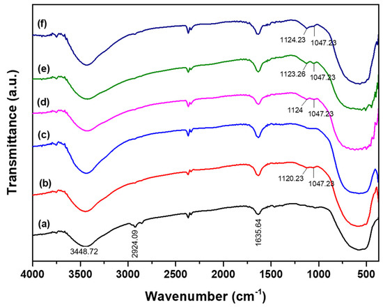 FTIR spectra of (a) pure TiO2, (b) S-TiO2, (c) Co-TiO2, (d) S-Co-TiO2 4%, (e) S-Co-TiO2 6%, and (f) S-Co-TiO2 8%.