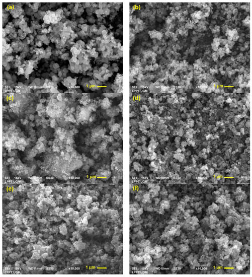 SEM images of (a) pure TiO2, (b) S-TiO2, (c) Co-TiO2, (d) S-Co-TiO2 4%, (e) S-Co-TiO2 6%, and (f) S-Co-TiO2 8%.