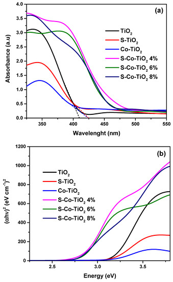The UV–Vis SRS spectrum revealed the optical properties and band gap energy of the photocatalyst. Figure 4 exhibits the UV–Vis SRS spectrum and Tauc’s plot of undoped, doped, and co-doped TiO2. As shown in Figure 4a, TiO2 shows an ultraviolet absorption semiconductor profile (200–400 nm) due to the large band gap energy of anatase TiO2 (3.2 eV). A small red-shift to the visible region was observed in the S-TiO2 sample due to the formation of a new sub-band gap in the valence band (VB) from the formation of the Ti–O–S bond after S doped to titania [37]. The new sub-band gap is formed by mixing the S3p orbital with the O2p orbital, which narrows the band gap of TiO2 [25]. The distinctive red-shift was also observed in the Co-TiO2 sample, indicating that Co-TiO2 has an absorption in the visible region. The optical absorption mechanism of undoped TiO2 is the transition energy from the valence band to the conduction band. The sp-d exchange interaction between the band electrons and the localized d-electrons of the Co2+ ion replacing the Ti4+ cation is responsible for the red-shift in the Co-TiO2 sample. This interaction between sp and pd causes a downward shift in the conduction band (CB) and an upward shift in VB, narrowing the band gap system [38].