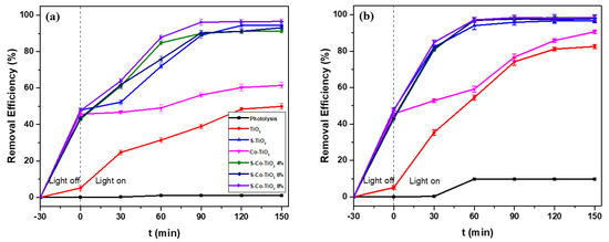 The prepared photocatalysts TiO2, S-TiO2, Co-TiO2, and S-Co-TiO2, were used in the photocatalytic removal of RBB under visible or UV-light irradiation separately to evaluate the photocatalytic activity before and after modification. In this experiment, 20 mg L−1 of RBB solution was added with the prepared photocatalyst and then irradiated with visible/UV light for a certain time. The results of RBB removal using various photocatalysts are shown in Figure 5.