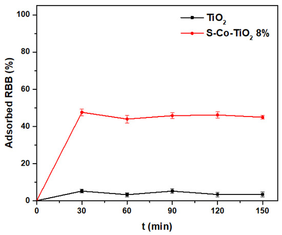 The decolorization process by the photocatalyst starts with the surface adsorption process and continues with the photocatalytic reaction. In order to evaluate the surface adsorption properties of the S-Co-TiO2 8% photocatalyst as well as to evaluate whether the adsorption process continued along with the photocatalytic process, the adsorption of the S-Co-TiO2 8% catalyst was carried out in the dark for 150 min without irradiation as shown in Figure 6. The undoped TiO2 adsorption test was also used for comparison purposes. The results indicate that adsorption takes place in the first 15 min and the concentration of the dye tends not to decrease, which implies that the next process is photocatalytic decolorization after a contact period of 15 min.