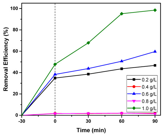 As shown in Figure 9, increasing the photocatalyst mass from 0.2 to 1.0 mg L−1 resulted in additional RBB removal, which was associated with an increased adsorption rate on the catalyst surface and increased hydroxyl radical formation. The photocatalyst mass of 1.0 g L−1 provided the highest decolorization efficiency. However, the amount of dye adsorbed on the surface of the photocatalyst was very high at the beginning of the reaction, whereas the photocatalytic reaction became insignificant. It can be seen that after 60 min of irradiation, the photocatalytic reaction did not continue since an excessive amount of photocatalyst had increased the number of active sites on the surface of the photocatalyst, allowing adsorption to dominate at the start of the process while the photocatalytic reaction becomes insignificant.