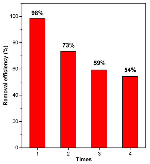 The stability and reusability of photocatalysts are critical parameters in the study of photocatalysts for use in sustainable wastewater treatment. The S-Co-TiO2 8% photocatalyst was tested for stability and reuse four times. In each test, S-Co-TiO2 8% was centrifuged and then washed and dried before being used in the next cycle under the same experimental conditions for 90 min of visible light irradiation. The reuse test results for S-Co-TiO2 8% photocatalyst are shown in Figure 11. The results showed that the S-Co-TiO2 8% sample had high decolorization efficiency after four reuse cycles, but there was a 44% decrease in decolorization efficiency after four uses. This could be due to the loss of photocatalyst during the iteration process. These findings suggest that the co-doped sample S-Co-TiO2 8% photocatalyst has promising potential and can be used repeatedly to remove dye pollutants.