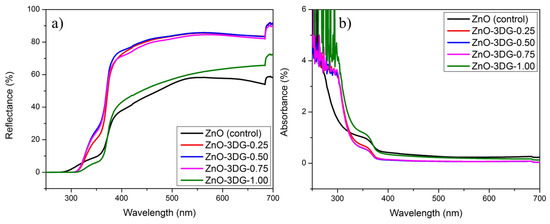 UV-visible spectrum of ZnO control and ZnO-3DG-(0.25, 0.50, 0.75, and 1.00) showing the (a) reflectance and (b) absorbance.