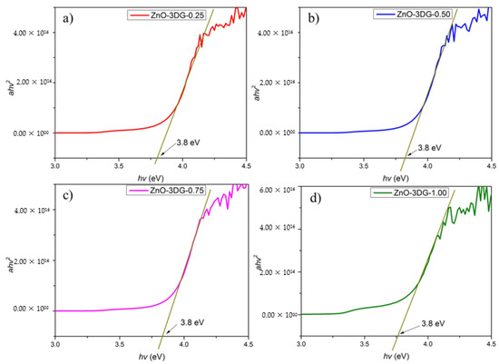 Band gap energies for (a) ZnO-3DG-0.25, (b) ZnO-3DG-0.50, (c) ZnO-3DG-0.75, and (d) ZnO-3DG-1.00.