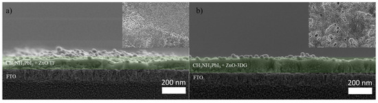 (a) FESEM cross-sectional image of CH3NH3PbI3 deposited on (a) ZnO and (b) (ZnO-3DG-0.25) thin films. Inset shows the respective surface morphology.