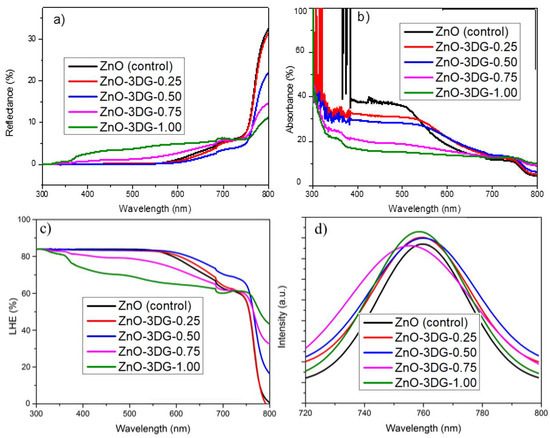 (a) Reflectance, (b) absorbance, (c) LHE, and (d) steady-state PL of the ZnO-3DG-(025, 0.50, 0.75, and 1.00) coated with CH3NH3PbI3.