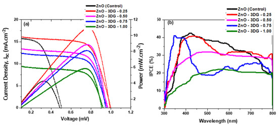 The measured photocurrent density–voltage (J-V) and IPCE for control ZnO and different 3DG samples are shown in Figure 9a,b, respectively. The JSC, VOC, FF, and the PCE of all the five cells are summarized in Table 1. The data show that all the photoanodes incorporated with 3DG recorded improvements in JSC and VOC compared to the control sample, although a systematic lowering was observed with the increase in concentration of 3DG. The highest PCE was delivered by ZnO-3DG-0.25 followed by 3DG modification of 0.5% and 0.75%. The ZnO-3DG-1.00 is able to deliver a PCE of 5.8%, which is higher compared with the control ZnO device (≈4.2%). From the plotted J-V graph as shown in Figure 9a, the ZnO-3DG-0.25-based device produced JSC ≈16.10 mA/cm2 and VOC ≈1.0 V, while ZnO-3DG-0.50 and 0.75 delivered 13.40 mA/cm2 and 12.40 mA/cm2, respectively. Despite the high JSC from control ZnO at 15.88 mA/cm2, the lower VOC reduced the PCE, whereas the 3DG-based devices exhibit high VOC. The ZnO-3DG-0.25 device showed only a nominally higher JSC compared to the control sample; however, the former registered 100% higher VOC and 25% higher FF than the ZnO-based control device. This phenomenon could be due to the better electron–hole separation, electron transportation, and reduced electron–hole recombination in the ZnO-3DG system. With better electron–hole separation, the enhancement in VOC can be observed in all the 3DG-modified photoanodes. However, with increased 3DG content, the JSC suffered due to increased recombination sites.