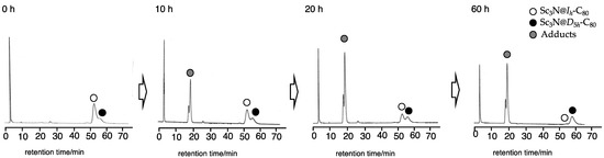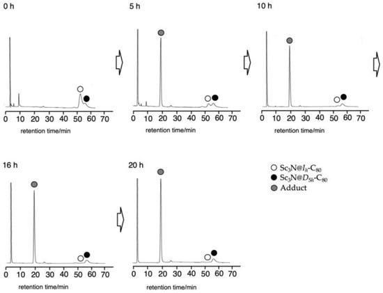 As described above, earlier reports have shown that Sc3N@Ih-C80 reacts with 1 under photolytic conditions to give the corresponding 1,2-adduct 2 and 1,4-adduct 3 [32]. To examine the reactivity of Sc3N@D5h-C80, a toluene solution of Sc3N@D5h-C80 and 1 was irradiated for 20 h using two 500 W halogen lamps (cut off < 400 nm) under an argon atmosphere (Scheme 1). However, Sc3N@D5h-C80 was found to be inert toward 1, as shown in the HPLC profiles of the photoreaction (Figure S1 in Supplementary Materials).