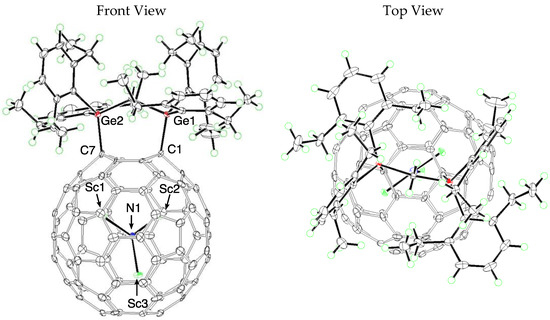 Fortunately, the 1,4-addition structure of 9 was determined firmly using the following X-ray crystallographic analysis. Black block crystals of 9 suitable for X-ray diffraction were obtained using the liquid–liquid bilayer diffusion method with CS2 and hexane at 0 °C. The crystal structure of 9 shows two disordered positions in the Ih-C80 cage with occupancies of 0.72 and 0.28, whereas the digermirane addend is ordered (Figure S11). This result suggests that the crystal structure of 9 includes a pair of diasteromers, which is consistent with the NMR observations. Disorder also exists in the orientations of the Sc3N clusters. They involve six locations of Sc atoms with a common N atom position. These Sc atom sites fall into two Sc3N sets with occupancies of 0.68 and 0.32. Figure 6 presents orientation of the cage and the Sc3N cluster in 9 with major occupancies.