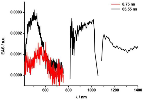 Evolution-associated spectra (EAS) obtained by the photolysis of Sc3N@Ih-C80 (λex = 387 nm, E = 400 nJ; Figure S12) at their respective relative delay times. The transient absorption of the triplet excited state of Sc3N@Ih-C80 is shown in black and for toluene in red.